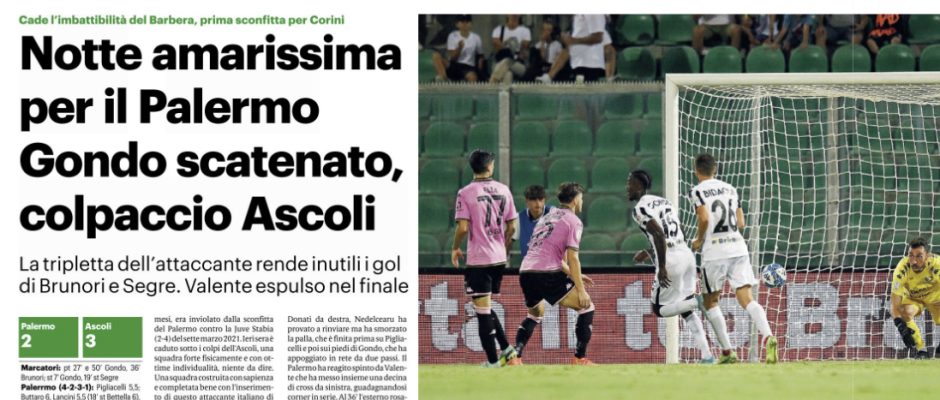 II Barbera cade in una partita di campionato dopo oltre diciassette mesi, era inviolato dalla sconfitta del Palermo contro la Juve Stabia (2-4) del sette marzo 2021. Ieri sera è caduto sotto i colpi dell’Ascoli, una squadra forte fisicamente e con ottime individualità, niente da dire.