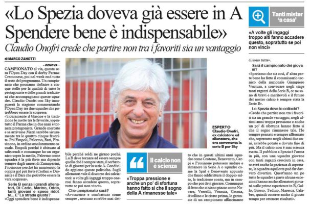 Intervistato da “La Nazione”, Claudio Onofri ha espresso il suo parere sul campionato di serie B che prenderà il via questa sera: «Sarà un campionato avvincente e combattuto come sempre – premette -, nessuno avrebbe mai detto che in questi ultimi anni squadre come Crotone, Carpi, Benevento e Frosinone potessero andare e rimanere in A. Spezia? Lo Spezia doveva già essere in A. Partire tra i non favori del pronostico è un vantaggio».