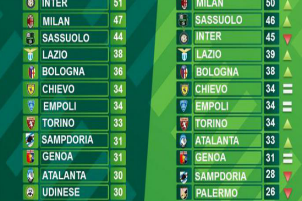 Controclassifica: Juventus 64, Napoli 63, Fiorentina 55, Roma 54, Milan 50, Sassuolo 46, Inter 45, Lazio 39, Bologna 38, Chievo 34, Empoli 34, Torino 34, Atalanta 33, Genoa 31, Sampdoria 28, Palermo 26, Udinese 26, Carpi 26, Frosinone 26, Verona 16.