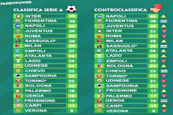 Nuova classifica senza errori arbitrali pubblicata dal bookmaker irlandese “Paddypower”. Secondo questa graduatoria, il Palermo dovrebbe occupare la quartultima posizione invece che la quintultima e dovrebbe contare 17 punti (una lunghezza in meno di quelli reali). In basso la classifica completa.