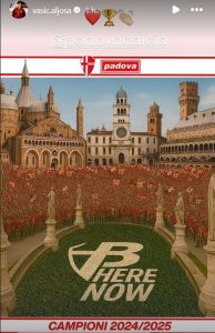 Gli otto gol e le sue ottime prestazioni con la maglia del Padova nella stagione 2022-23 hanno permesso ad Aljosa Vasic di impressionare il Palermo, che poi decise di puntare sulle qualità del classe 2002. Il duttile centrocampista rosanero non dimentica, dunque, quanto il club veneto abbia fatto per lui. Infatti, attraverso le proprie Instagram stories, Vasic si congratula con il Padova dopo aver centrato il ritorno in Serie B, conquistando la promozione grazie allo 0 a 0 rimediato sul campo del Lumezzane in occasione dell’ultima giornata del Girone A di Serie C: