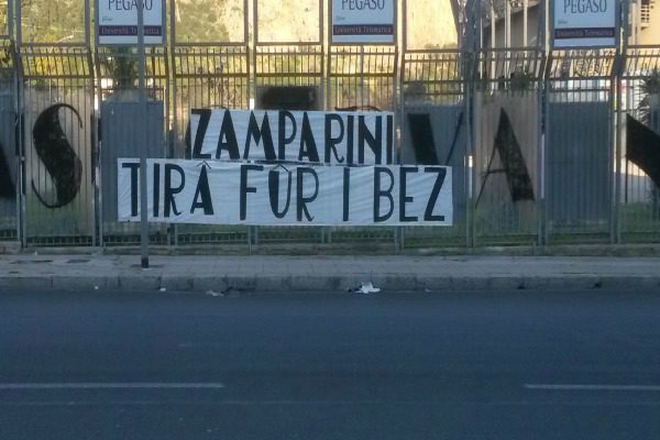 In mattinata, al “Renzo Barbera”, è apparso un ulteriore striscione rivolto direttamente al patron rosanero Maurizio Zamparini. I tifosi in questione hanno addirittura esposto lo striscione in dialetto friulano, esortando il patron a mettere mano al portafoglio. Questo quanto scritto: “Zamparini tira fur i bez“. In alto la foto in questione pubblicata online da “Meridionews.it”.