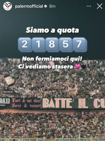 Questa sera, allo stadio Renzo Barbera, andrà in scena Palermo-Bari. Il club, mediante una stories su Instagram, chiama a raccolta i tifosi. Di seguito quanto scritto: “Siamo a quota 21857. Non fermiamoci qui! Ci vediamo stasera”. In alto la foto.