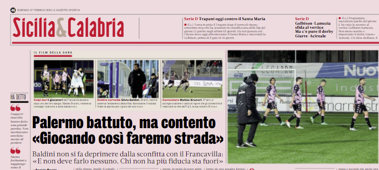 L’edizione odierna de “La Gazzetta dello Sport” si sofferma sulla sconfitta del Palermo contro la Virtus Francavilla.