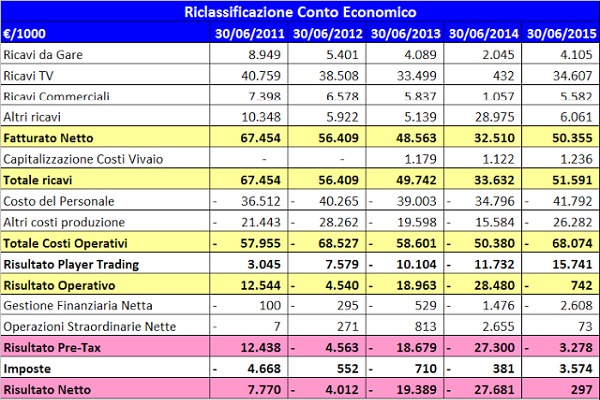 Il risultato prima delle imposte risulta negativo per € 3.277.560, nel 2013/14 era negativo per € 27.300.251; mentre nel 2012-13 era negativo per 18,7 milioni di Eruo. I risultato aggregato supera abbondantemente la soglia di tolleranza del FFP di Euro 30 milioni.
