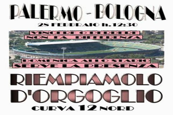 Visto il brutto momento che il Palermo sta attraversando, ora più che mai serve l’apporto dei tifosi alla squadra di Iachini. Quale miglior modo per dimostrare il proprio affetto se non quello di riempire lo stadio domencia prossima? Ecco infatti che i sostenitori rosanero sui social si mobilitano per far accorrere più gente possibile al “Renzo Barbera” domenica alle ore 12.30. Di seguito il volantino creato dalla pagina “Curva Nord 12”: