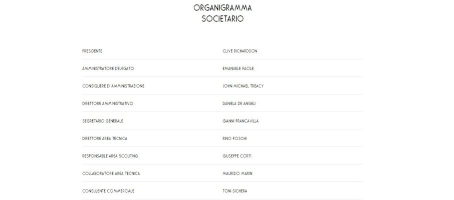 Il passaggio di proprietà in casa Palermo era già stato annuncia, così come era stato annunciata la modifica dell’organigramma societario cosa che però non era stata ufficializzata. Adesso il club di viale del Fante, sul proprio sito ufficiale, ha modificato ha pubblicato l’organigramma societario che vede Richardson presidente, Facile amministratore delegato e Treacy consigliere d’amministrazione. In alto la foto di quanto pubblicato sul sito del club rosanero.