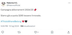 E’ iniziata la campagna abbonamenti del Palermo 2024/25. In questa prima fase gli abbonati della passata stagione possono confermare il proprio posto. Attraverso i propri social il club fa sapere che sono già state rinnovate 3295 tessere.