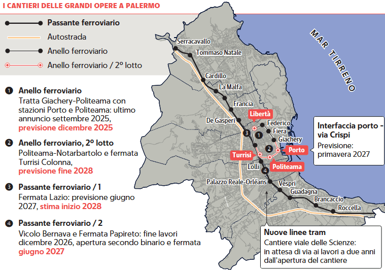 Nel suo servizio su Repubblica Palermo, Amato evidenzia anche il trasferimento del quartier generale della D’Agostino da piazzetta della Pace – che sarà liberata entro fine anno – a via Malaspina, dove sono partiti i lavori dell’ultimo lotto che chiuderà l’Anello ferroviario. La tratta Politeama–Notarbartolo, con la nuova stazione Turrisi Colonna, dovrebbe concludersi entro il 2028.