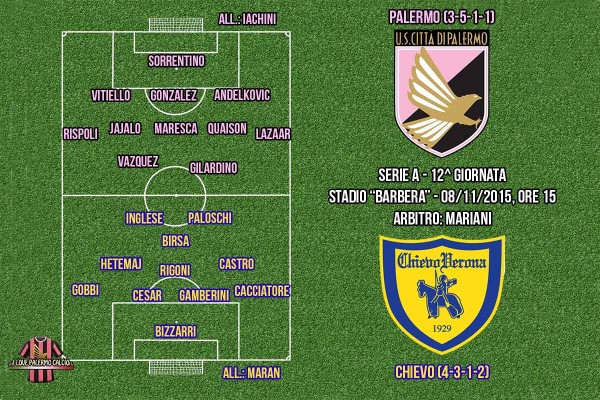 ULTIME CHIEVO Mister Rolando Maran arriva a Palermo senza lo squalificato Meggiorini e gli infortunati Izco, Frey e Mattiello. L’ex tecnico del Catania disporrà i suoi in campo con un 4-3-1-2 che vedrà Bizzarri protagonista tra i pali. In difesa la coppia centrale Gamberini-Cesar, terzino destro Cacciatore con Gobbi che coprirà la fascia mancina. Ballottaggio in cabina di regia, dove l’ex rosanero Nicola Rigoni (fratello di Luca) si contenderà la maglia da titolare con Radovanovic. A completare la mediana Castro sul centrodestra ed Hetemaj sul centrosinistra. Sulla trequarti spazierà poi Birsa, alle spalle della coppia Paloschi-Inglese. Quest’ultimo dovrebbe infatti spuntarla su Pellissier.