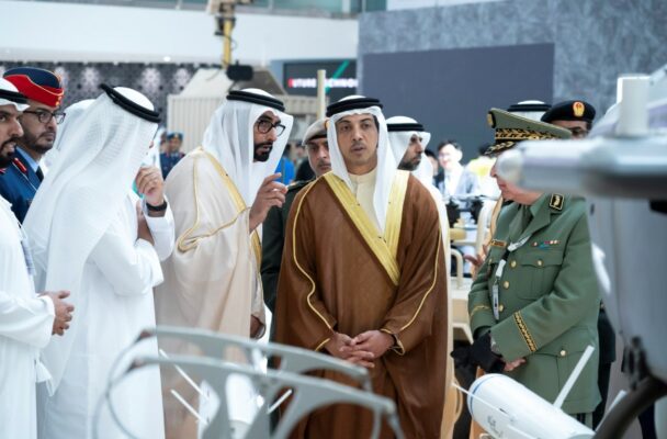 ABU DHABI, UNITED ARAB EMIRATES - February 23, 2020: HH Sheikh Mansour bin Zayed Al Nahyan, UAE Deputy Prime Minister and Minister of Presidential Affairs (centre R), tours of the fourth edition of UMEX (Unmanned System Exhibition and Conference) at Abu Dhabi National Exhibition Centre (ADNEC). Seen with HE Ahmed Juma Al Zaabi, UAE Deputy Minister of Presidential Affairs (centre L). ( Hamad Al Kaabi / Ministry of Presidential Affairs )​ ---