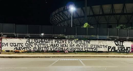 E’ terminata la stagione 2024/2025 per i rosanero, dopo l’uscita dai playoff contro la Juve Stabia. Non è finita, come già preannunciato dai supporters rosanero, la contestazione che ha caratterizzato l’ultima parte della stagione del club di viale del Fante. La Curva Nord Inferiore ha esposto un nuovo striscione con dichiarazioni chiare: