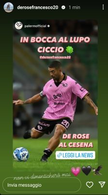Attraverso le proprie storie Instagram Francesco De Rose ha condiviso l’annuncio del Palermo sul suo addio scrivendo: “Non vi dimenticherò mai”. In alto la storia.