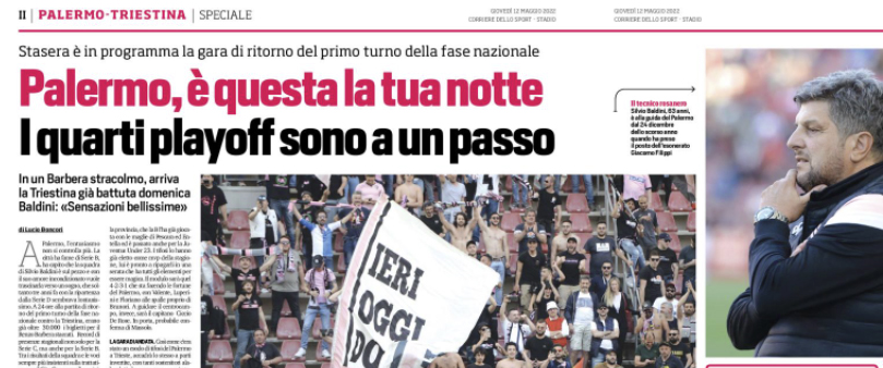 L’edizione odierna de “Il Corriere dello Sport” si sofferma sulla gara di questa sera del Palermo contro la Triestina con il Barbera delle grandi occasioni a spingere la squadra verso il passaggio al prossimo turno playoff sempre più vicino.