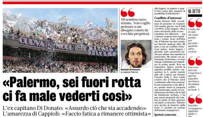 L’edizione odierna de “La Gazzetta dello Sport” ha riportato le parole di alcuni ex rosanero i quali si sono espressi in merito alla retrocessione in C del Palermo. Ecco il pensiero di Cappioli: «Spero di sbagliarmi, per l’amore che nutro per Palermo e i suoi tifosi – ammette l’ex centrocampista della Roma – ma non sono molto ottimista. Il fatto che i play-off siano iniziati senza aspettare l’appello, non mi fa pensare nulla di buono. La prima sentenza è stata scioccante e la C sarebbe un inferno, per quanto è difficile e complicata».