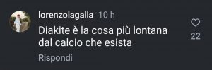 Dopo il pareggio del Palermo sul campo Mantova, alcuni tifosi hanno espresso il loro disappunto attraverso i social per il risultato ottenuto dai rosanero al Martelli. Tra i commenti che spiccano in uno dei post sul profilo del club rosanero c’è quello di Lorenzo Lagalla, figlio del sindaco di Palermo, che ha espresso in modo critico la sua opinione su Diakité, affermando: “Diakité è la cosa più lontana dal calcio che esista”.