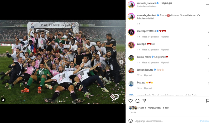 Palermo in B, Damiani festeggia sui social: “Ce l’abbiamo fatta!” (FOTO)