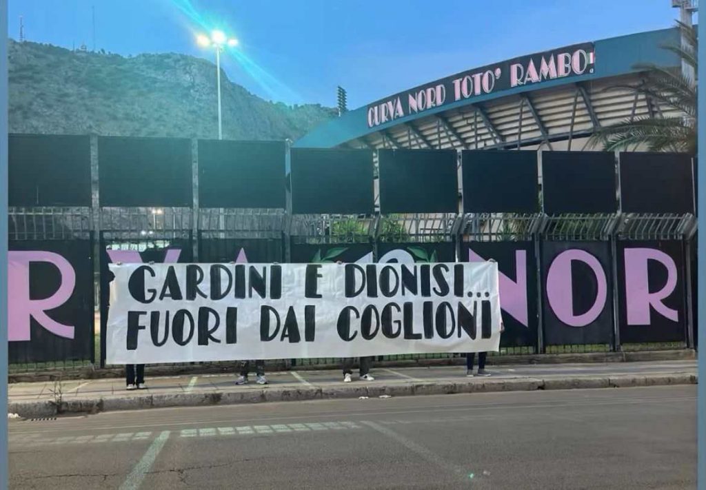 Non si placa il malumore della tifoseria rosanero. A poche ore dall’ultima giornata di campionato contro la Carrarese, allo stadio Renzo Barbera sono apparsi nuovi striscioni di contestazione rivolti al direttore generale Giovanni Gardini e all’allenatore Alessio Dionisi.