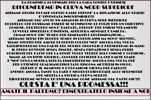 “Abbiamo deciso di fare questo passo perché la situazione allo stadio è diventata insostenibile. Abbiamo già avuto un assaggio in curva nord inferiore di quel che possiamo essere se si uniscono le forze per un obiettivo comune. Purtroppo non è bastato, perché per unirsi veramente ci vuole sincerità d’intenti, apertura mentale e umiltà. Ormai non è più tempo per rimpianti e recriminazioni… Abbiamo speso fin troppo tempo in questi anni, ma non è servito. Siamo stufi! Per amore di questi colori “noi” ancora una volta sacrificheremo una parte del nostro orgoglio e prenderemo in mano il ferro rovente senza timore, senza esitazioni e senza dubbi, coscienti del fatto che la gente vuole vedere solo unione e coesione, siamo ad un bivio storico. Occorre decidere da che parte stare. “Noi” con la nostra scelta dimostreremo ancora una volta che per ottenere qualsiasi risultato bisogna mettersi in gioco. Questo è il momento e l’occasione giusta per farlo, avendo ancora tanto da dare e sicuri di poter riportare allo splendore che merita la storica Curva Nord. Riporteremo novità ed entusiasmo come abbiamo già fatto giù. Questa è una promessa. Amate il Palermo? Dimostratelo insieme a noi.”