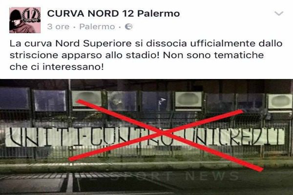 I tifosi rosanero della Curva Nord Superiore, attraverso la propria pagina Facebook “Curva Nord 12”, si dissociano dallo striscione apparso questa mattina al “Barbera”, sul caso Zamparini-Unicredit. “La curva Nord Superiore si dissocia ufficialmente dallo striscione apparso allo stadio! Non sono tematiche che ci interessano!“, scrivono gli ultras. E’ spontaneo chiedersi, dunque, chi ha appeso lo striscione? Si tratta di un singolo o di un gruppo? Il/I tifoso/i rimangono attualmente anonimi…