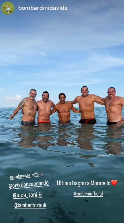 Nella foto pubblicata da Davide Bombardini su Instagram, si riconoscono — da sinistra — Stefano Sorrentino, Cristian Zaccardo, Davide Bombardini, Luca Toni e Lamberto Zauli: un gruppo che ha scritto pagine indimenticabili della storia recente del Palermo, tra promozioni, gol e stagioni memorabili in Serie A.