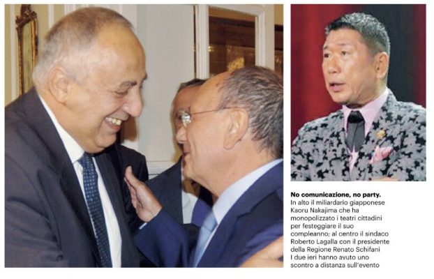 La notizia della festa in città del miliardario giapponese Kaoru Nakajima, diventa terreno di scontro tra la Regione c il Comune. ll governatore Renato Schifani ha espresso tutto il suo disappunto per le location – il teatro loliceama e il teatro Massimo-che per l’ex presidente del Senato non sarebbero consone ad cattività di questo tipo, che potrebbero aprire una finestra senza precedenti, in forza della quale anche altri privati potrebbero chiedere analogo trattamento».