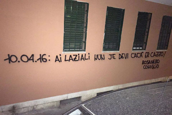 I tifosi della Lazio continuano ad inveire contro i supporters del Palermo, nonostante la sfida calcistica sia terminata. Dopo i tafferugli nel centro del capoluogo siciliano, quest’oggi a Roma sono apparsi addirittura dei murales con su delle scritte offensive nei confronti dei tifosi rosanero. Ecco in basso le foto: