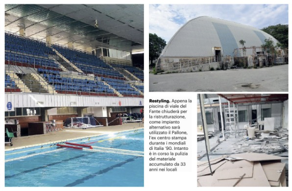 E’ una corsa contro il tempo me l’amministrazione comunale garantisce che il Pallone, l’ex centro stampa dei mondiali di calcio ‘90 diventerà una piscina, nell’attesa che all’inverno della comunale di viale dei Fante vengano realizzate le opere di restyling. Un po più scettiche sui tempi le federazioni e le associazioni sportive che, chiusa la piscina comunale per i lavori, temono di rimanere sprovviste di impianto per gli allenamenti.