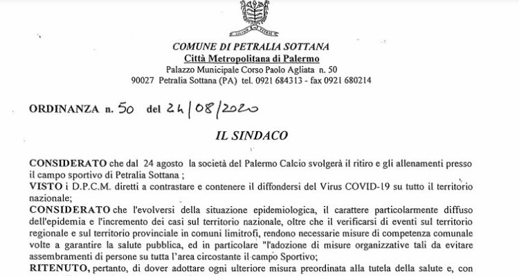 Tuttavia, il Comune di Petralia Sottana ha emesso un’ordinanza in cui sancisce l’assoluto divieto di ingresso del pubblico all’interno del campo sportivo dove si allenano i rosanero. E’ inoltre vietato il transito il transito e la sosta dei pedoni nell’area circostante il campo e nell’area antistante la palestra eccetto i cittadini autorizzati.