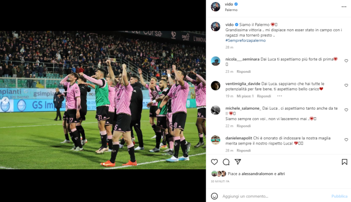 Palermo-Reggina, Vido sui social: “Grandissima vittoria, tornerò presto in campo” (FOTO)