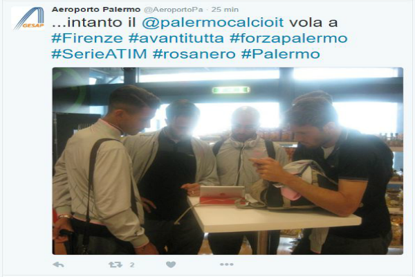 Rosanero in partenza per Firenze, dove domani pomeriggio faranno visita alla Fiorentina in quel dello stadio “Franchi”. In alto una foto che ritrae Vazquez, Maresca, Gilardino e Goldaniga in attesa dell’imbarco a Punta Raisi. L’immagine è stata pubblicata su Twitter dalla pagina ufficiale dell’aeroporto.