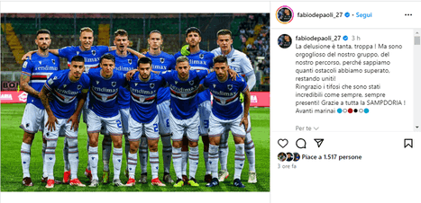 Il calciatore della Sampdoria, Fabio Depaoli attraverso il proprio profilo Instagram ha pubblicato un post esprimendo la propria delusione dopo la sconfitta contro il Palermo e l’esclusione dai playoff.