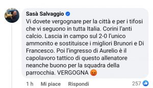 “Vi dovete vergognare per la città e per i tifosi che vi seguono in tutta Italia. Corini l’anti-calcio. Lascia in campo sul 2-0 l’unico ammonito e sostituisce i migliori, Brunori e Di Francesco. Poi l’ingresso di Aurelio un capolavoro tattico di questo allenatore neanche buono per la squadra della parrocchia”.