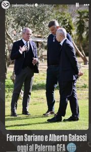 Il City Group prova a far sentire la sua presenza in casa Palermo, impegnato tra due giorni in occasione della prima sfida del 2025 contro il Modena, valida per la 21esima giornata di Serie B. Il club siciliano, infatti, nelle proprie Instagram Stories ha pubblicato una foto che ritrae Ferran Soriano e Alberto Galassi a Torretta, rispettivamente amministratore delegato della holding britannica e consigliere amministrazione del Palermo. La visita dei due dirigenti è servita per confrontarsi con la squadra e con Carlo Osti, nuovo direttore sportivo rosanero.