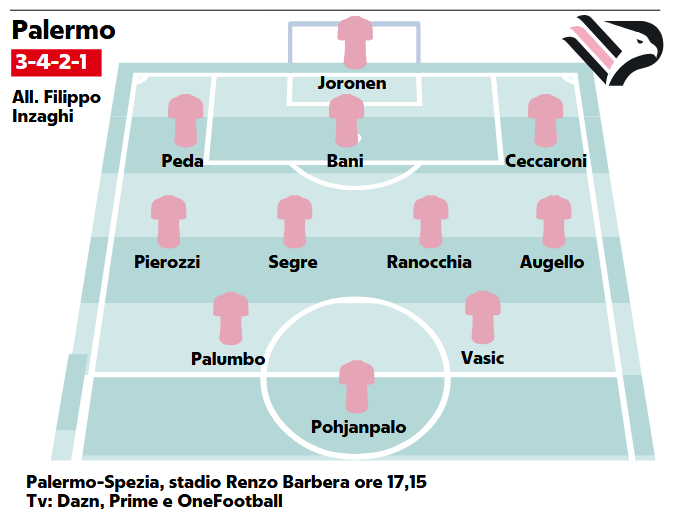 Dal punto di vista tattico, il Palermo dovrebbe confermare il 3-4-2-1. In avanti il punto di riferimento resta Joel Pohjanpalo, capocannoniere della Serie B, pronto a guidare l’attacco dopo aver gestito le energie in settimana. Alle sue spalle spazio a Palumbo e Vasic, favorito su Le Douaron. In mezzo al campo agiranno Segre e Ranocchia, con Pierozzi e Augello sugli esterni. In difesa Joronen tra i pali e terzetto composto da Bereszynski, Bani e uno tra Veroli e Ceccaroni, quest’ultimo reduce da un attacco febbrile ma tornato ad allenarsi. Magnani è indisponibile, ma Inzaghi guarda già al suo rientro: «Un pezzo da novanta. Avremo un’arma in più per il futuro», parole riportate da Alessandro Geraci su la Repubblica Palermo.