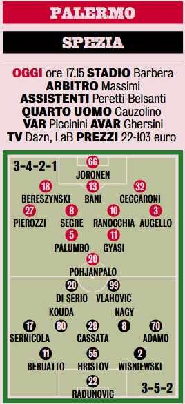 È tutto pronto al “Barbera” per Palermo-Spezia, sfida in programma oggi alle 17.15 e valida per il campionato di Serie B. I rosanero vanno a caccia della quinta vittoria interna consecutiva, mentre lo Spezia cerca punti pesanti per rilanciarsi. Secondo quanto riportato dalla Gazzetta dello Sport, Filippo Inzaghi – squalificato e sostituito in panchina da D’Angelo – è orientato a confermare il 3-4-2-1 con una novità significativa sulla trequarti.