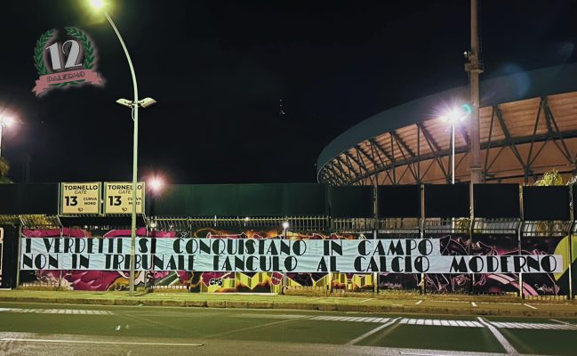 Palermo, striscione Curva Nord 12 contro il calcio moderno: “I verdetti si conquistano in campo non nei tribunali” (FOTO)