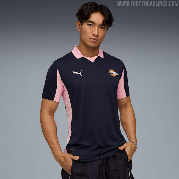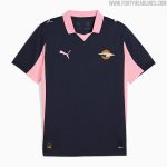 La maglia da trasferta presenta un design nero di ispirazione retrò, arricchito da accenti rosa chiaro su maniche e colletto. Particolarmente degno di nota è l’utilizzo dello stemma vintage del Palermo, risalente al periodo 1924-1935, che aggiunge un tocco nostalgico e rende omaggio alla lunga storia del club. Il colletto a polo esalta ulteriormente lo stile retrò della divisa.