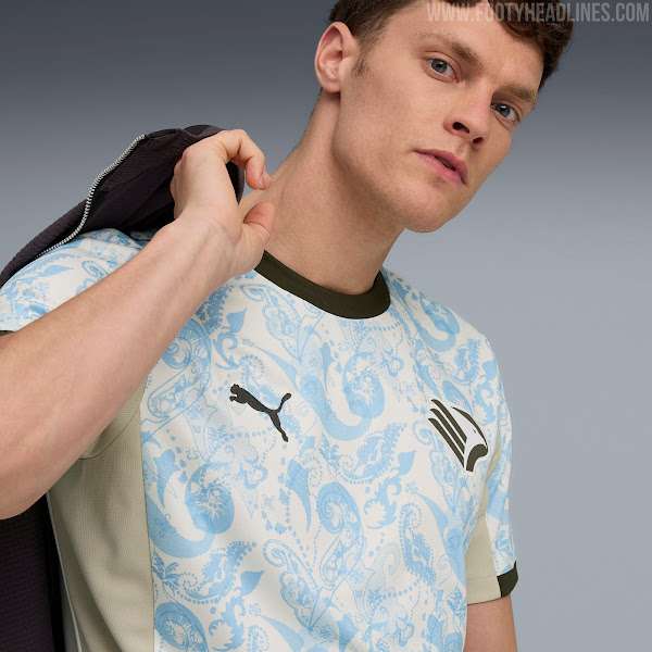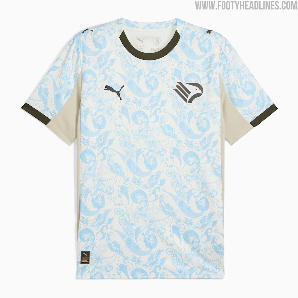 La terza maglia offre un design unico e sofisticato, con una base bianco sporco decorata da motivi barocchi azzurri su fronte e maniche, abbinati a dettagli verde oliva. Questo look distintivo richiama l’atmosfera della maglia da trasferta del Portogallo per il 2024, superando i limiti estetici pur mantenendo intatta l’identità del Palermo grazie all’inclusione dello stemma aggiornato del club.