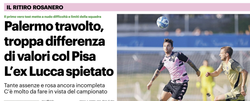 Al primo vero test stagionale dopo il 12-0 rifilato ai dilettanti del Marineo, il Palermo viene travolto per 5-0 dal Pisa di Maran in una gara a senso unico fin dall’inizio. Tante le assenze nella squadra di Silvio Baldini che doveva rinunciare a Luperini, Accardi, Soleri, Damiani, Peretti, Crivello, Felici e il portiere Pigliacelli.