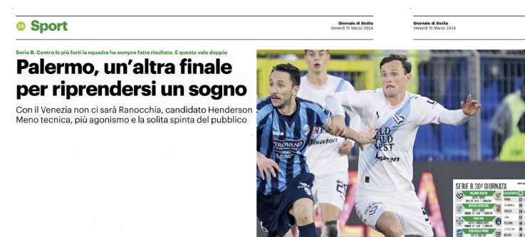 L’edizione odierna de “Il Giornale di Sicilia” si sofferma sul Palermo che oggi si giocherà un’altra finale.