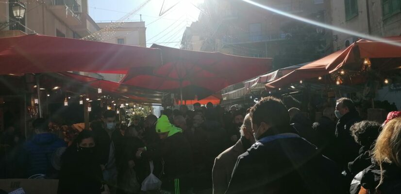 La città non è deserta come durante il lockdown deciso per la pandemia la scorsa primavera ma in giro ci sono pochi passanti, si vede qualche famiglia in bicicletta e giovani in monopattino. Qualcuno approfitta dei negozi che possono stare aperti per fare gli ultimi aquisti da mettere sotto l’albero. Sono affollati invece i mercati popolari come quello in via Montalbo, Ballarò e il Capo. Lunghe file – con le persone non proprio distanziate – davanti ai pescivendoli e ai macellai.