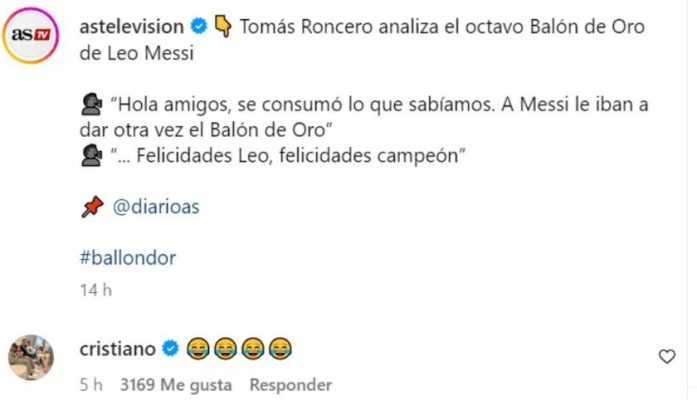 Ieri sera Lionel Messi ha vinto il suo ottavo Pallone d’oro in carriera. Alcuni giornalisti, tra cui Tomas Roncero di AS, ha manifestato sui social la sua disapprovazione, commentata poi da Cristiano Ronaldo con quattro faccine che ridono. La reazione del portoghese ha generato polemiche sul web, in quanto non ritenuta corretta e rispettosa.
