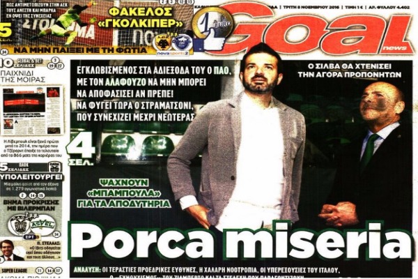 Momento complicato per Andrea Stramaccioni sulla panchina del Panathinaikos. L’allenatore del club greco è uscito pesantemente sconfitto nel derby contro l’Olympiakos per 3-0. I tifosi, imbufaliti, hanno chiesto la testa dell’allenatore. Il proprietario del club, Giannis Alafouzos, ha convocato Stramaccioni per chiedere spiegazioni. Secondo i giornali greci il ds Gilberto è già alla ricerca di un nuovo allenatore. L’esonero dell’ex allenatore dell’Inter appare sempre più vicino. In più, un quotidiano greco è uscito in edicola con il titolo “Porca miseria” riferito proprio a Strama, proprio come avvenuto con Ranieri quando allenava la nazionale greca (anche se, in quel caso, il titolo era più forte)