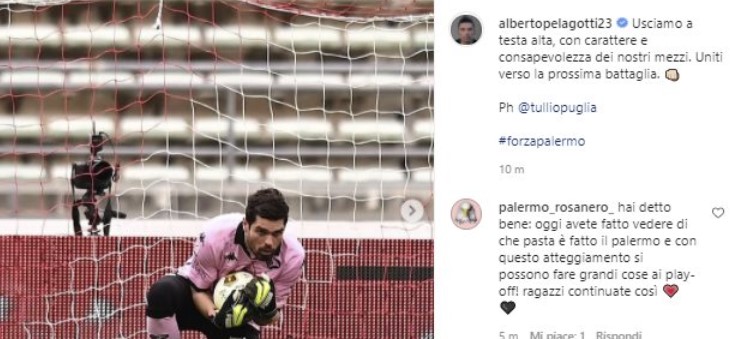Il portiere del Palermo Alberto Pelagotti commenta così su Instagram il pareggio per 2-2 contro il Bari: “Usciamo a testa alta, con carattere e consapevolezza dei nostri mezzi. Uniti verso la prossima battaglia”.
