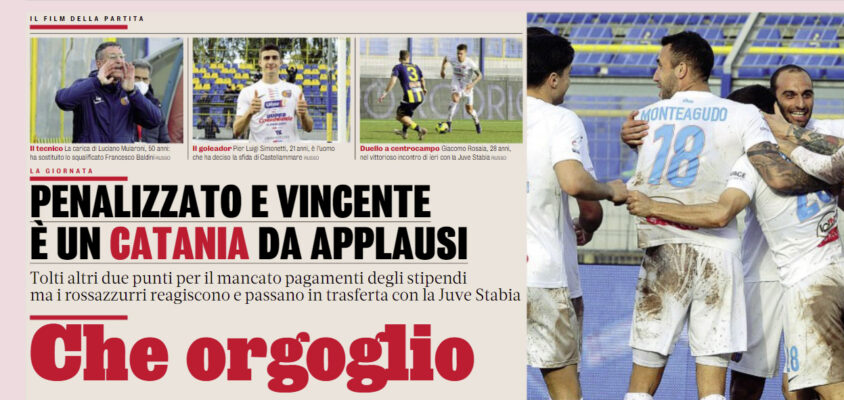 L’edizione odierna de “La Gazzetta dello Sport” si sofferma sulla situazione del Catania che ieri ha battuto la Juve Stabia ma allo stesso tempo ha ricevuto un’altra penalizzazione in classifica.