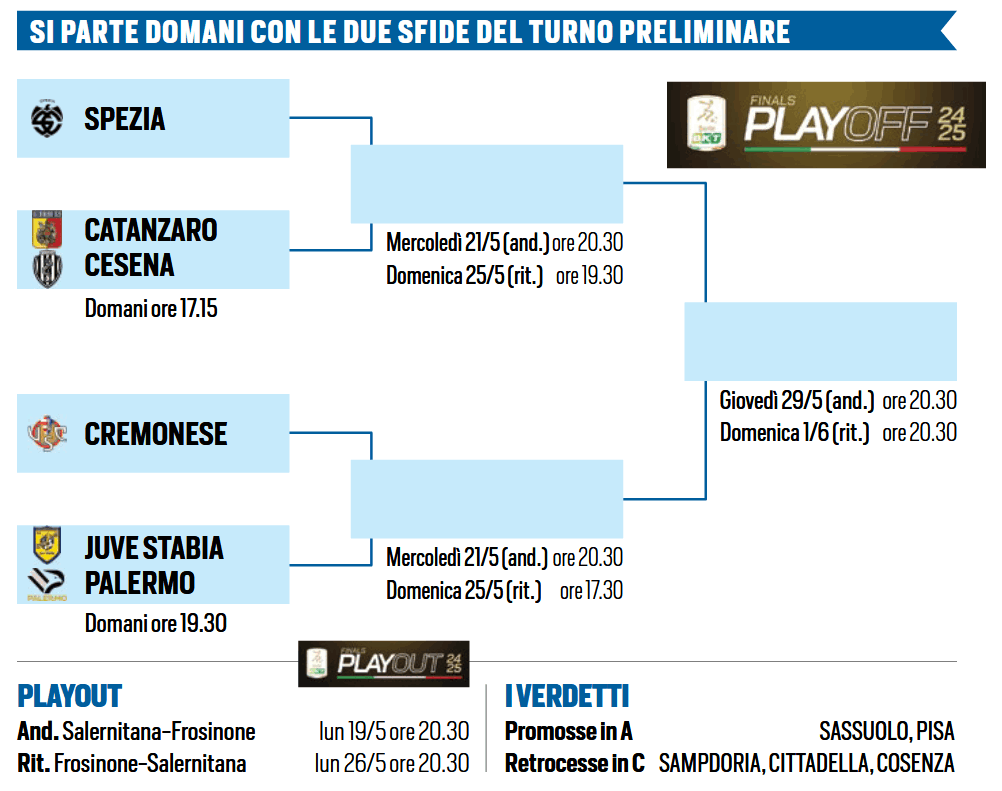 Chiude terzo e può permettersi di pareggiare tutte e quattro le partite per centrare la promozione. Il Spezia di D’Angelo ha tutto: la miglior difesa del campionato (36 gol subiti), un attacco efficace con Pio Esposito (17 gol), e un centrocampo guidato da Salvatore Esposito, la cui condizione sarà cruciale. E non è un caso: anche nel 2020 i liguri salirono in A da terzi.