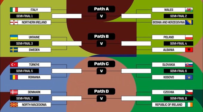 Dal sorteggio di Nyon emergono anche gli accoppiamenti degli altri Path, anch’essi con la formula di andata e ritorno. Nel Path B possibile finale tra due delle squadre più attrezzate di questo playoff, Svezia e Polonia. Mentre termina nel Path D la Macedonia del Nord dell’ex Palermo Trajkovski, autore della rete che non permise all’Italia di qualificarsi ai mondiali 2022.