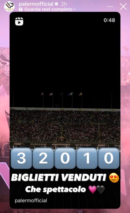 Per superare lo scoglio veneziano servirà, nuovamente, l’enorme sostegno dei tifosi rosanero che anche questa volta non mancherà all’appello. Il club del Viale del Fante, mediante una stories Instagram, ha pubblicato il dato aggiornato sui biglietti venduti: sono, ad oggi, 32.010. Si aspetta, dunque, una nuova ondata rosanero a riempire gli spalti di un Barbera che merita, di certo, altri palcoscenici. In alto la foto.