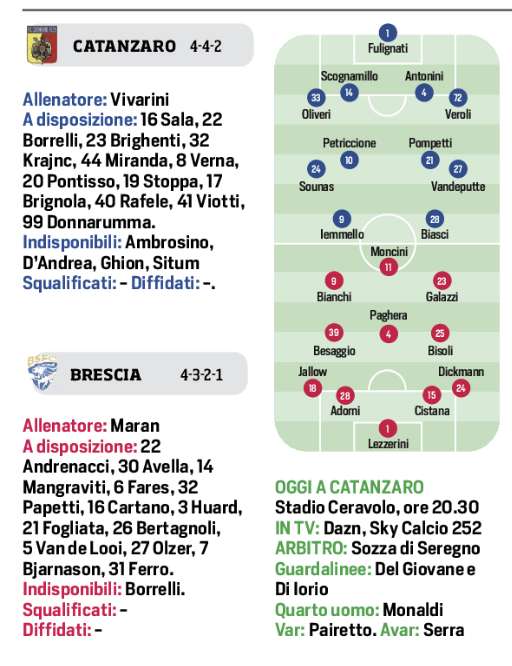 OGGI A CATANZARO Stadio Ceravolo, ore 20.30 IN TV: Dazn, Sky Calcio 252 ARBITRO: Sozza di Seregno Guardalinee: Del Giovane e Di Iorio Quarto uomo: Monaldi Var: Pairetto. Avar: Serra